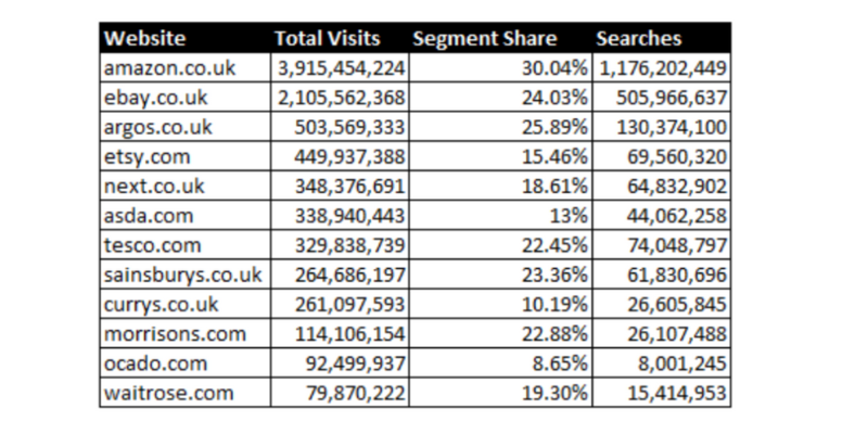 Search is a dominant way for many consumers to find the products they are looking for, and we often find that navigating to a specific category page is not always the most seamless experience. Amazon are king of segment share, with consumers choosing to run a search. It commands around 30 percent of the overall traffic on Amazon.co.uk based on the last 30 days. This is considerable traffic that far exceeds the total visits of other retailers in this comparison.