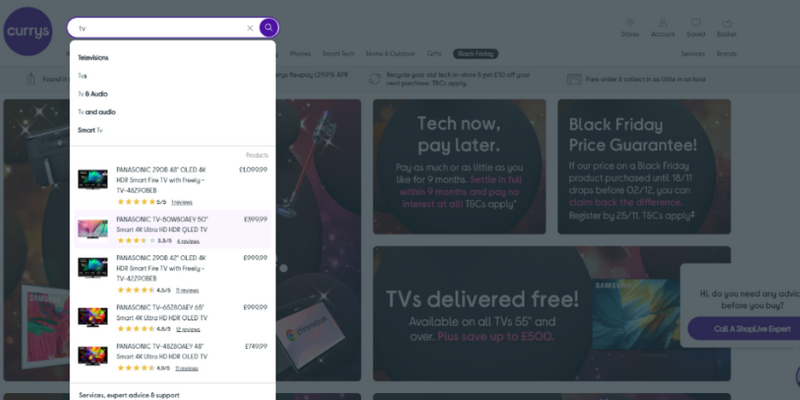 At the other end of the spectrum, we see the likes of Currys, where consumers appear to take a slightly different path. When a user performs a search, a number of suggested keywords and products appear together. This experience may lead consumers not to land on a single search results page, but instead to navigate directly to a relevant product by refining their search.