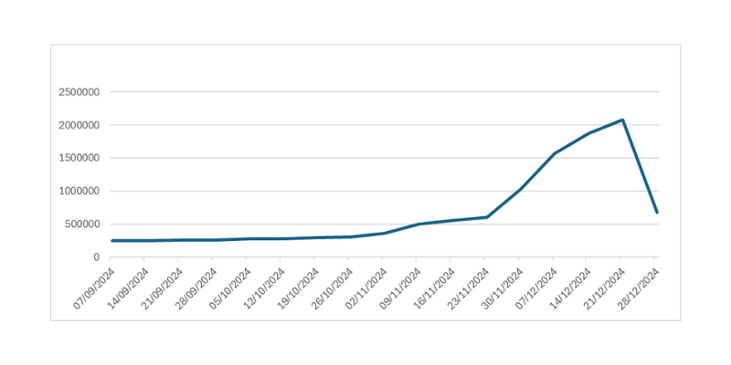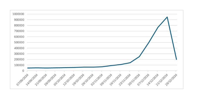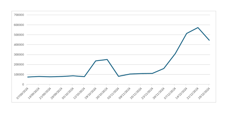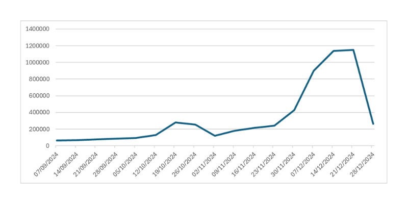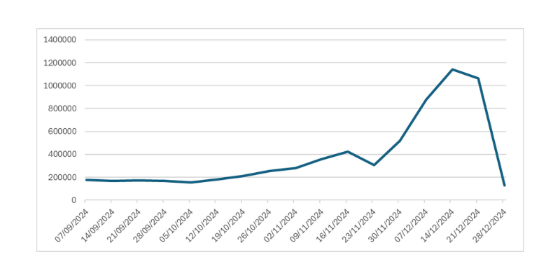Searches start increasing from mid-October, reaching their highest point in the week commencing 14 December, also fuelled by last-minute Christmas shopping.